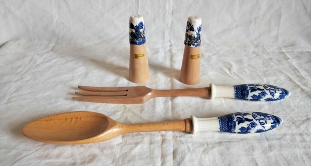 servizio cucchiaio e forchetta più sale e pepe in legno e ceramica
