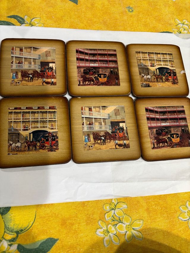Dettagli del prodottoSet di sottobicchieri con stampe d'epoca raffiguranti scene di vita cittadina con carrozze.