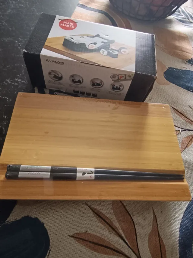Dettagli del prodottoSet per preparare il sushi in casa, marca Kasanova. Include la macchina per fare i sushi e un paio di bacchette.