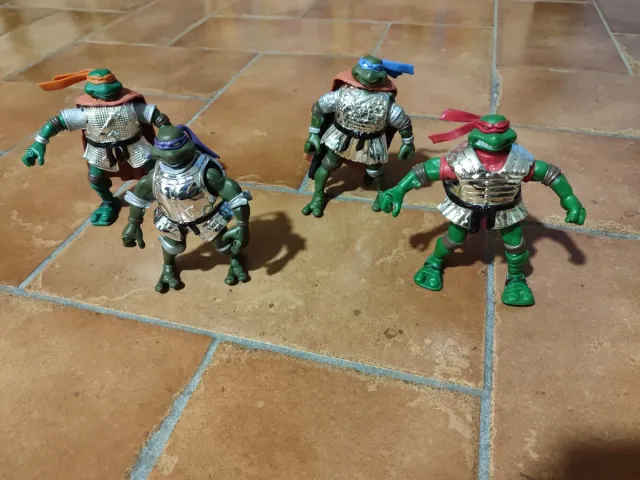 Set completo delle Tartarughe Ninja in versione cavalieri. - Personaggi con armature argentate. - Include tutti e quattro i personaggi.