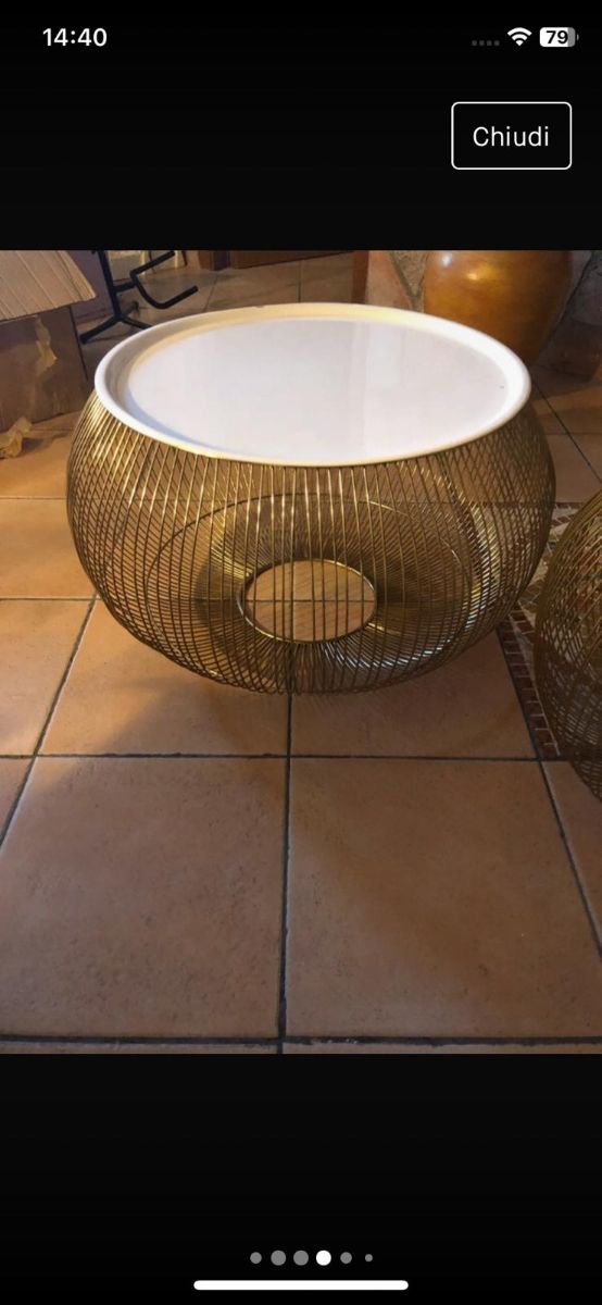 Set tavolini oro con base bianca a palla altezza 41 dm grande 52 dm piccolo 41. La base del grande leggermente scorticata