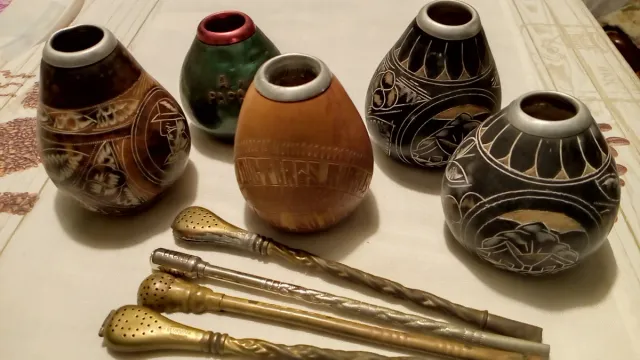 Dettagli del prodottoSet di tazze e bombilla per erba mate, di origine argentina. Ideali per gustare la tradizionale bevanda.