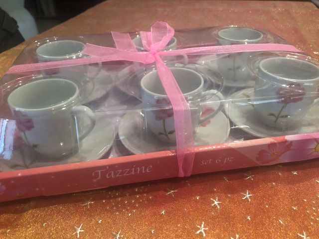 6 tazzine da caffè con relativi piattini in ceramica bianca con decori rosa
