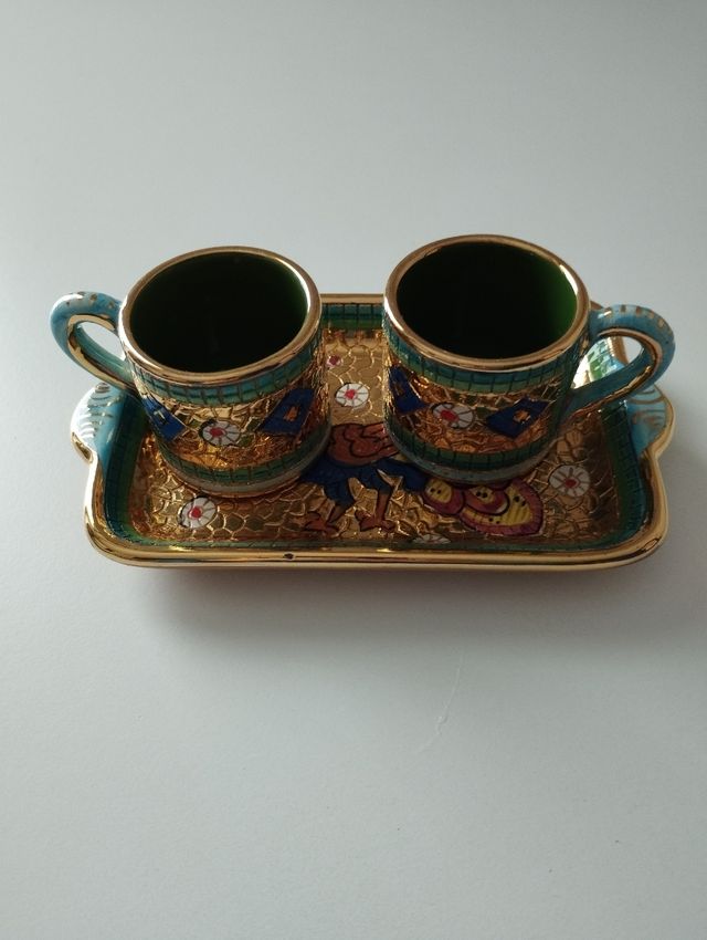 Bellissimo set di tazzine da caffè con vassoio in ceramica di Deruta decorato a mano in oro zecchino. Un vero capolavoro! Vendibile anche abbinato alla tazza da tè con piattino, della stessa linea. Tutto nuovo.