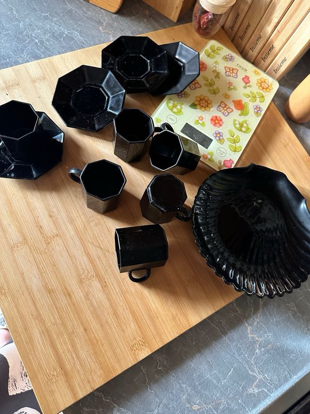 6 tazzine da caffe’ con piattini e 1 piattino a conchiglia in omaggio tutto nero