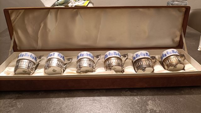 Set tazzine caffè in porcellana con supporto in argento 800 lavorato finemente.Mai usato. Anni 60