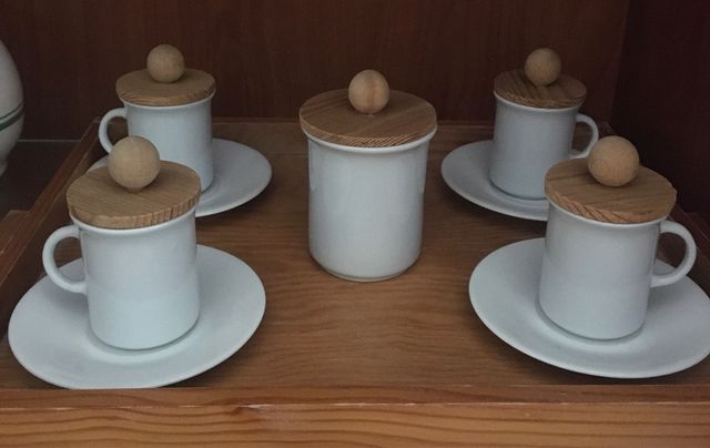 Dettagli del prodottoTazzine e zuccheriera in ceramica con tappo decorativo in legno su vassoio in legno Misure del prodotto