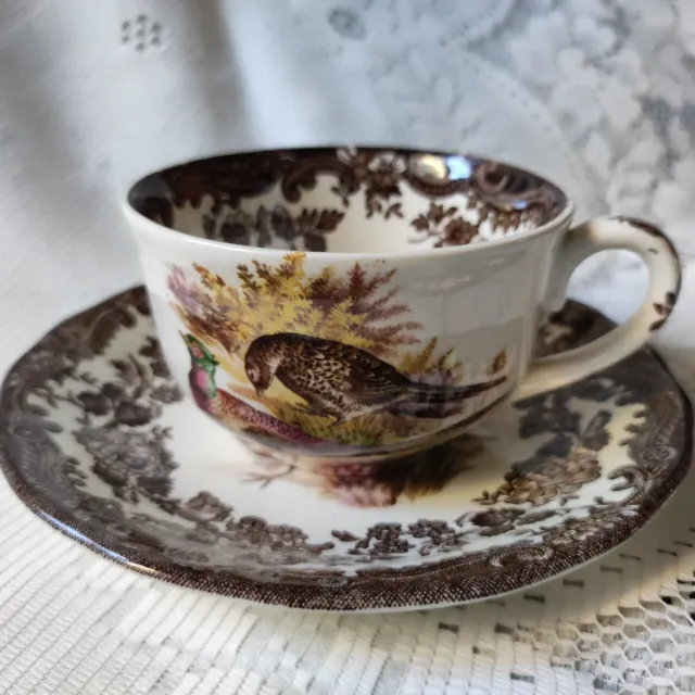 Decoro con beccacce e una fagiani sia sulla tazza che sul piattino.