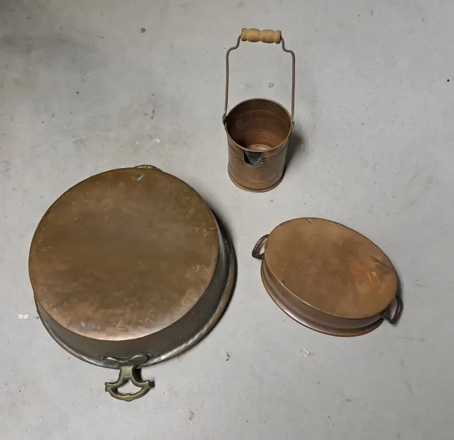 Dettagli del prodottoSet di pentole in rame, ideali per la cucina o come arredamento composto da tre pezzi.