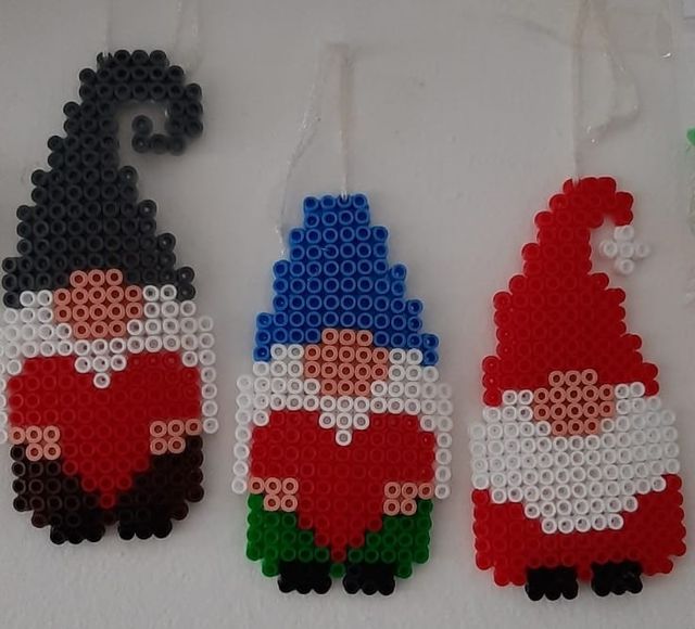 Dettagli del prodottoSet di 3 addobbi per Natale che rappresentano 3 gnomi con cappelli assortiti. cm 14x7. Realizzati con perline tipo Hama Beads . 11 euro per tutto il set .