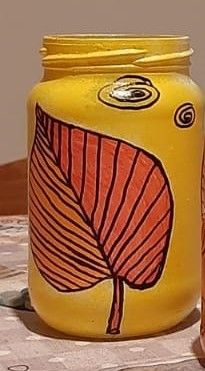 Dettagli del prodottoVaso in vetro per piante e fiori. Decorazione artigianale: pittura artigianale a tema autunno: sfondo giallo con foglia arancione. Pezzo unico.