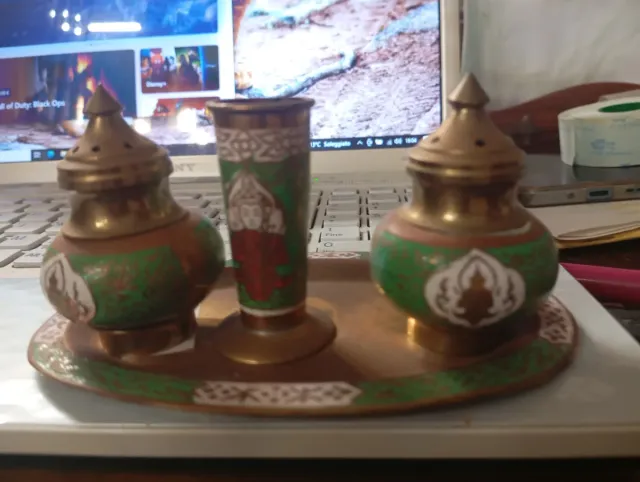 Dettagli del prodottoElegante set vintage composto da due porta sale e pepe un porta stuzzicadenti realizzati in metallo ottone con decorazioni smaltate.