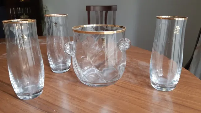 Set Vintage composto da un cestello per il ghiaccio e 3 bicchieri da spumante in cristallo al piombo con bordo dorato