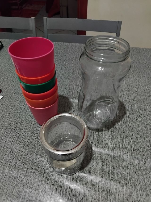 E bicchieri in plastica e 3 vasetti in vetro