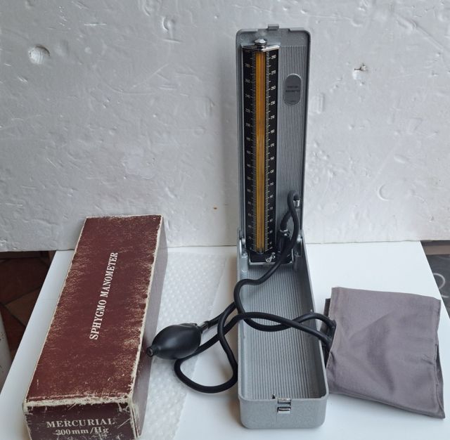 Sfigmomanometro manuale in metallo, completo di bracciale e pera. - Scala graduata fino a 300 mmHg. - Custodia originale inclusa.