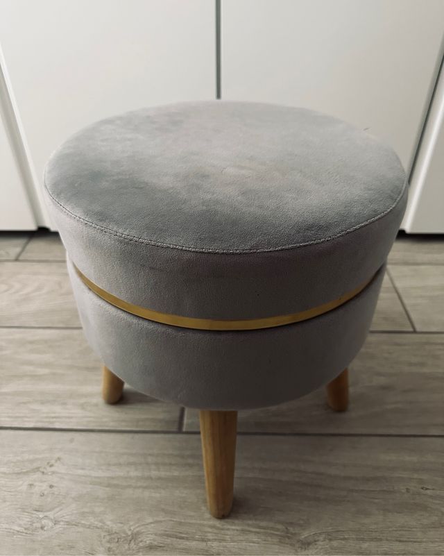Sgabello come nuovo grigio e dettaglio color oro e piedini color legno