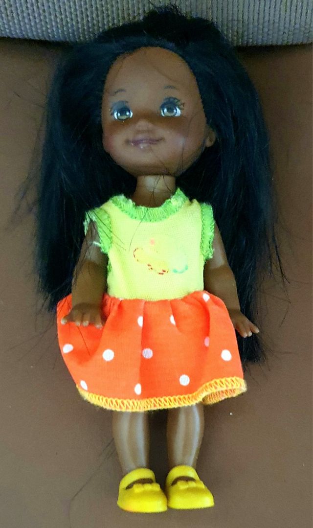 Dettagli del prodotto Shelly di colore di Barbie, anno 1994. Vestito originale; altezza 11 cm. Marca Mattel. Da collezione. Rara. Potete trovare altre Shelly e Barbie nel mio profilo.