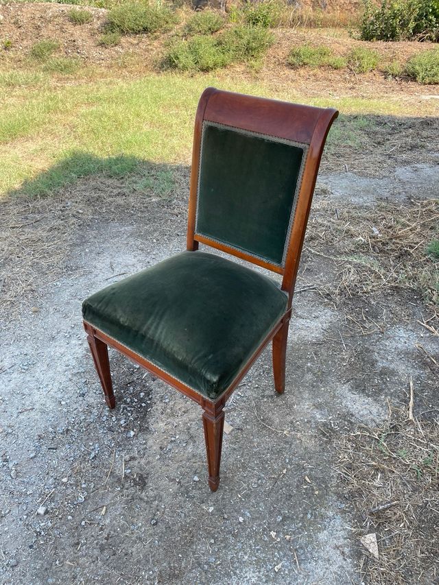 Dettagli del prodottoSedie in legno massello con schienale dritto, rivestite in velluto verde.