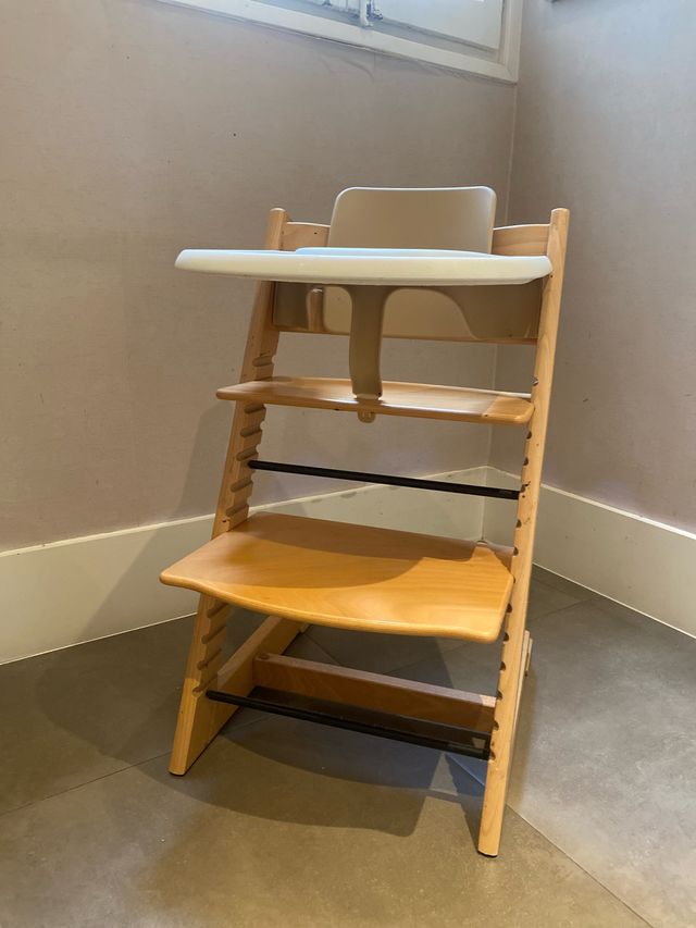 Dettagli del prodottoSedia per bambini Stokke Tripp Trapp in buone condizioni, con vassoio. Struttura in legno. Vassoio in plastica. La descrizione è stata tradotta automaticamente.