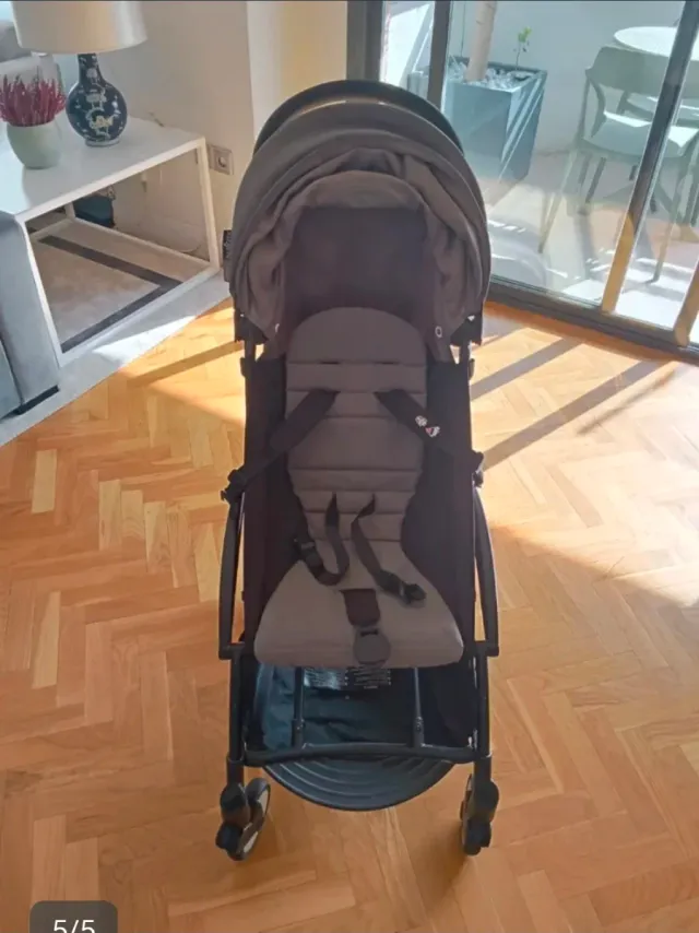 Seggiolino da passeggio Yoyo, compatto e leggero. Colore grigio scuro. Capottina estensibile. Imbracatura di sicurezza a 5 punti.