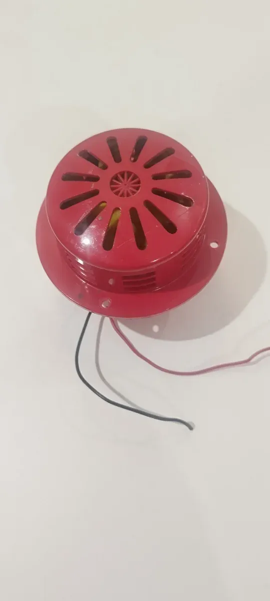 Sirena Electra modello W10 da 6V. Colore rosso. Design circolare con griglia. Include cavi di connessione.