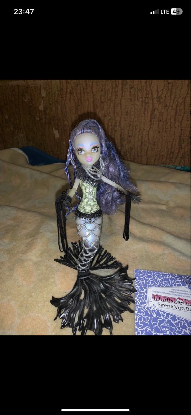 Bambola Sirena Von Boo della linea Monster High. La bambola ha lunghi capelli viola e una coda da sirena.