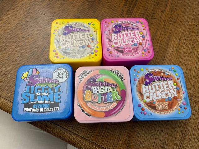 Scatole Skidol, quello che hanno all’interno si vede in foto, la scatola azzurra non si chiude perfettamente. Misure circa 8,2x8,2x4cm.
