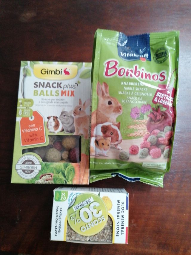 Dettagli del prodottoVendo snack per coniglietti, perfetti per viziare i vostri amici pelosetti! Sono inclusi: 1 confezione di Gimbi Snack plus Balls Mix, 1 confezione di Vitakraft Borbinos e 1 blocco di pietra minerale. I prodotti sono nuovi e in ottime condizioni.