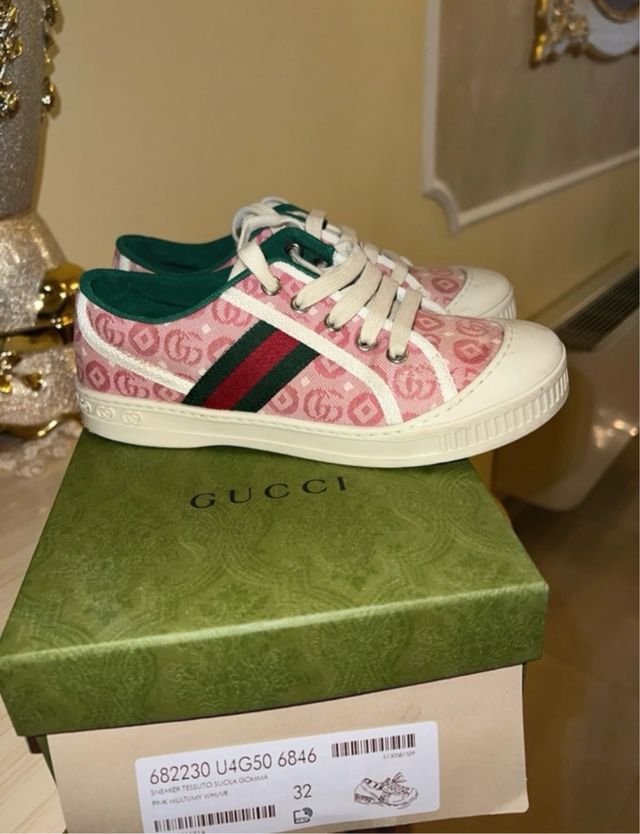 Sneakers Gucci per bambina in ottime condizioni. - Tessuto GG Supreme rosa. - Dettaglio nastro Web verde e rosso. - Suola in gomma. - Modello U4G50 6846.