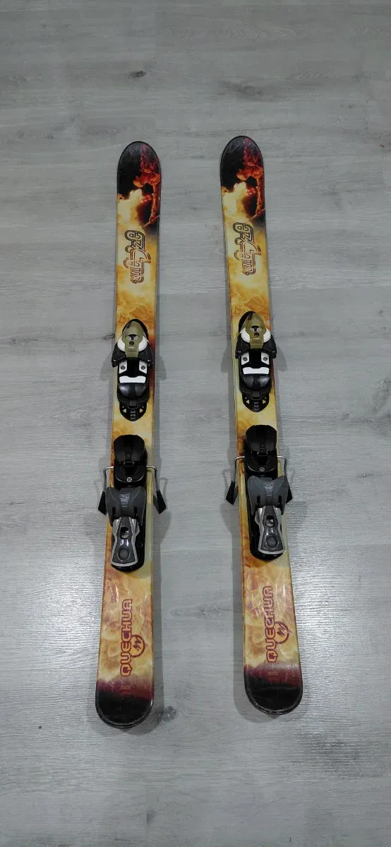 Dettagli del prodottoSnowblade Quechua con fissaggi. Misura 120 cm. Design con stampa di fuoco e dettagli in giallo. Marca Quechua visibile nella parte inferiore. La descrizione è stata tradotta automaticamente.