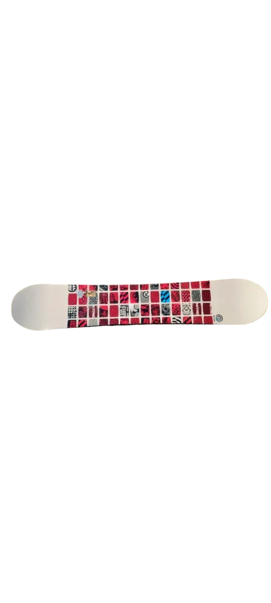 Dettagli del prodottoSnowboard con un design grafico accattivante e colorato. La base è bianca, mentre la parte centrale presenta un pattern di riquadri rossi, neri e bianchi con vari disegni.