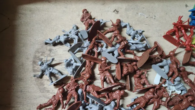 Lotto di soldatini in plastica, ideali per collezionisti. - Soldatini di varie dimensioni e colori. - Alcuni pezzi presentano accessori come scudi e armi.