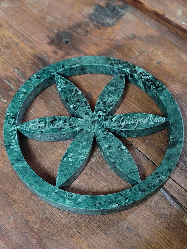 Dettagli del prodottoBellissimo sole delle Alpi in marmo verde, lavorato a forma di fiore stilizzato. Un pezzo unico ed introvabile della storia della Lega Nord a Pontida!