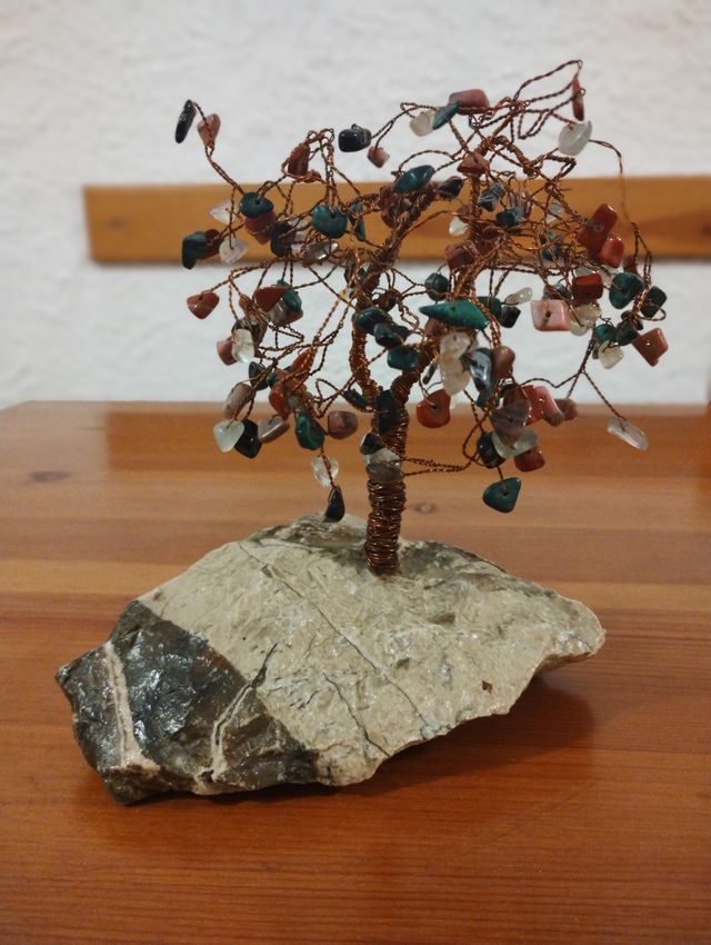 alberello fatto artigianalmente con base in pietra, rami e tronco in rame e chioma in pietre naturali