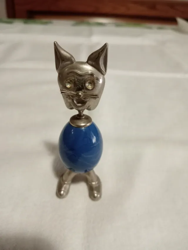 Grazioso soprammobile vintage a forma di gatto. Alto 9,5 cm, circonferenza 9 cm. - Realizzato in onice. - Dettagli in metallo lucido.
