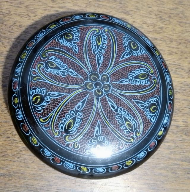 set 6 sottobicchieri in legno laccato, dipinti a mano, con contenitore. Praticamente nuovi