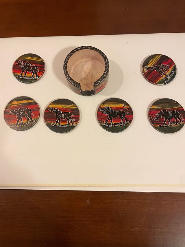 Dettagli del prodottoSet di sottobicchieri in pietra scura con decorazioni etniche raffiguranti animali africani. Il set include un porta sottobicchieri.