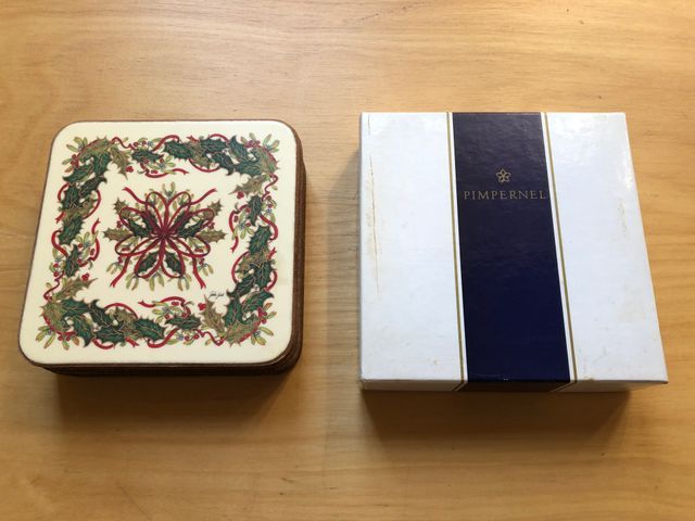 Scatola con 6 sottobicchieri come da foto. Bordo lievemente rovinato. Dimensioni: 10,5x10,5cm