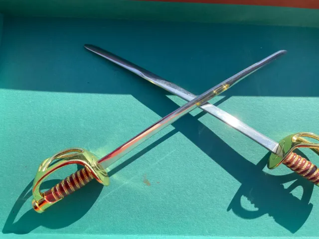 Coppia di spade decorative, ideali come soprammobile o per collezionismo. - Impugnatura dorata con dettagli rossi. - Lama in metallo lucido.