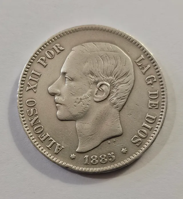 Dettagli del prodottoMoneta da 5 Pesetas spagnola, con l'effigie di Alfonso XII, anno 1885.