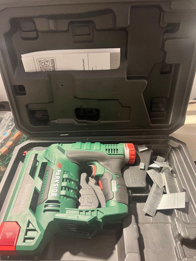 Dettagli del prodottoSparachiodi, punzonatrice e graffettatrice parkside elettrica a batteria PAT 20 li A1, utilizzata pochissimo, perfettamente funzionante con diverse graffe e chiodi inclusi.