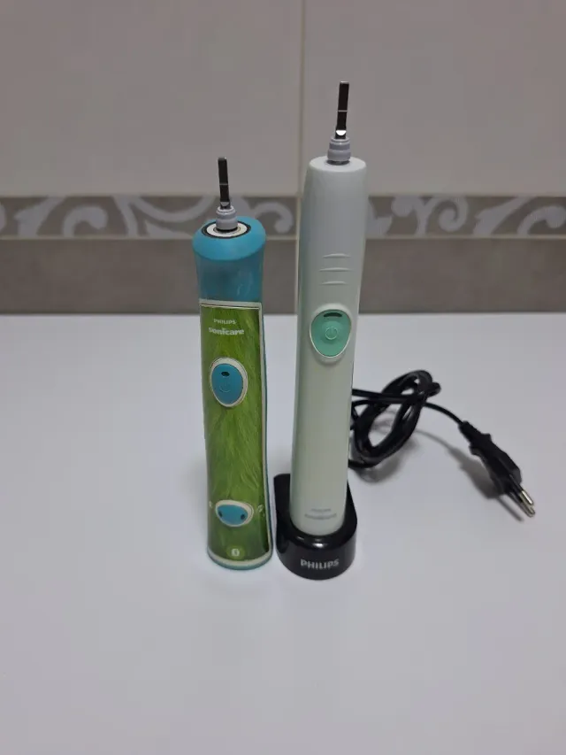Set di due spazzolini elettrici Philips Sonicare. - Uno di colore bianco con base di ricarica. - Uno di colore blu e verde con design a tema.