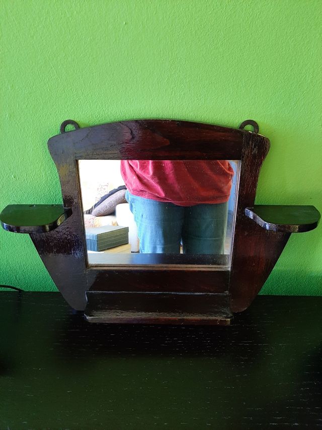 Specchietto da parete con piccole mensole, legno verniciato di marrone scuro. Dimensioni ingombro: 26x 40 cm ca. - specchio: 20 x 15 cm ca. Necessita di restauro.