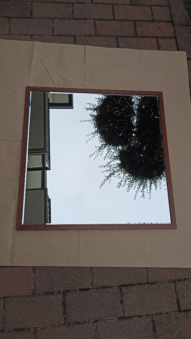 Specchio con cornice in legno Misure: 62,5 cm x 62,5 cm spessore 1 cm. Qualche leggero segno di usura sulla cornice (vedere ultima foto)