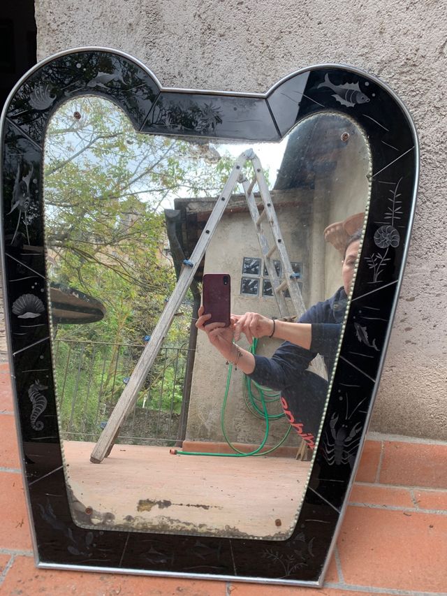 Dettagli del prodottoSpecchio vintage di forma particolare con cornice specchiata nera a motivi marini Misure del prodotto