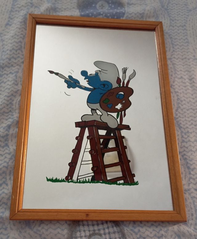 Dettagli del prodottoSpecchio vintage da appendere, con puffo pittore all'opera, cornice in legno, in perfette condizioni.