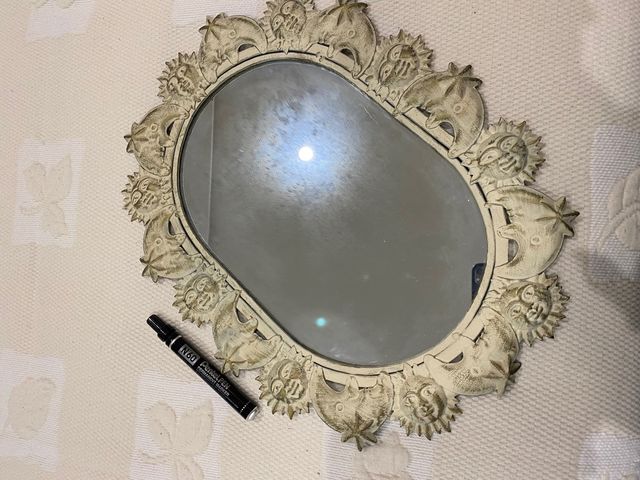 Specchio vintage con decorazioni sole e luna. Il materiale è metallo.