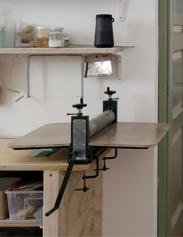 Dettagli del prodottoSpianatrice per argilla portatile. Si smonta e si monta facilmente occupando poco spazio. Realizzata a mano da un artigiano. Si può usare senza bisogno dei panni. Scrivetemi in privato per vedere il video del funzionamento.