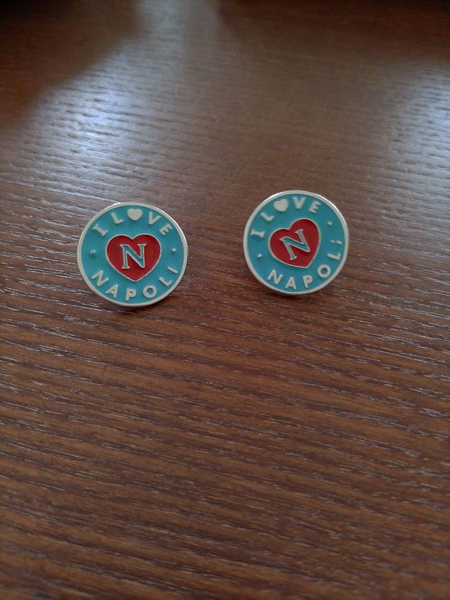 Set di due spille I love Napoli con cuore e lettera N. - Design rotondo con bordo argentato. - Colore azzurro con dettagli rossi e bianchi.