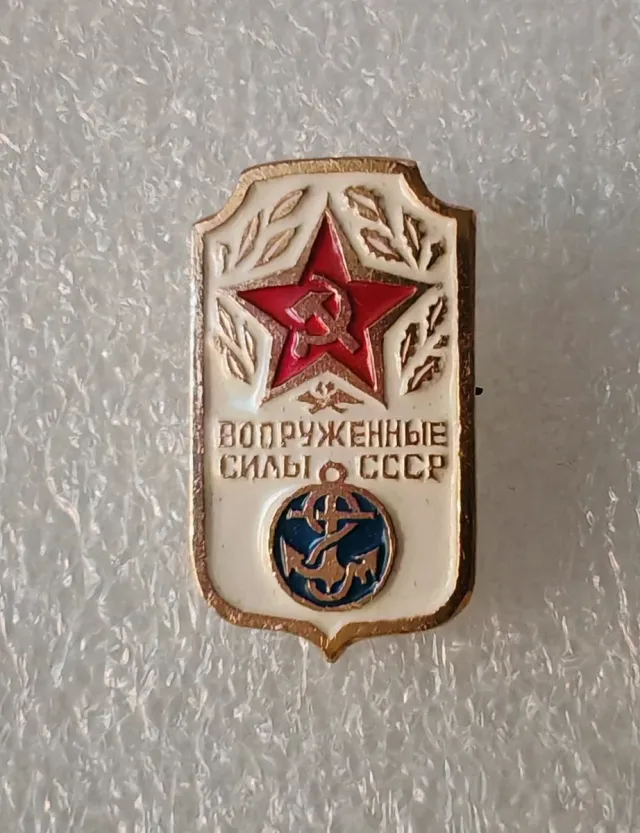 Spilla distintivo Forze Armate URSS con ancora e stella rossa. - Smaltata bianca e rossa. - Dettagli dorati. - Simbolo dell'ancora e della marina sovietica.